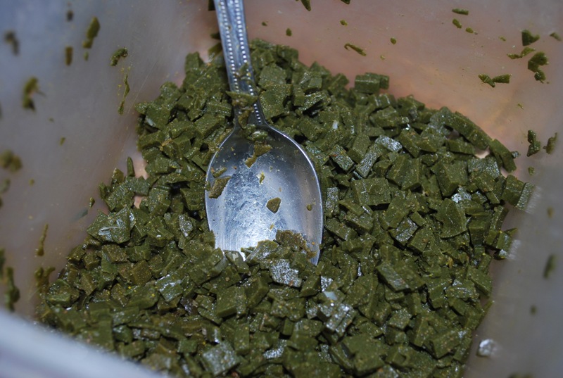 I have been advocating the use of moist food for years.  Moist food moves more easily through the digestive tract, results in more efficient nutrient assimilation, and also minimizes balance/buoyancy problems many fish have after eating dry food.  Unfortunately, most goldfish foods have no moisture content at all.  That’s because, with the exception of frozen foods, others would spoil and have no shelf-life.  So, most goldfish food is “dry as a boneâ€, and ultimately not the best for the fish, even if the ingredients are high quality.  Our fish farmers raise the goldfish on moist food, so it makes no sense to switch them to a dry diet after they are imported.  We’ve addressed this issue for years by “hydrating†all of the pellets we’ve fed.  This involved a slow process of introducing moisture and refrigerating pellets to make sure they were soft throughout, and not just wetted on the outside.  This made them like little meatballs, but they still held together and didn’t fall apart in the tank.  Well, we have quit messing around with pellets!  That’s because after months of trials, and many conversations with fellow hobbyists for over a year, we feel that Soilent Green is the best solution for the main staple in the Goldfish diet.  I used to make my own gel food, but it was time consuming, messy, and I never felt confident that the mix of ingredients was optimal.  Soilent Green solves these issues with an easy to make product.  Brought to a boil in a non-stick pan, and poured onto a non-stick cookie sheet, it gels quickly with little to no clean up.  Anything left in the pan gels up and peels right off.  Once a batch is made, we chop it up on a cutting board into bite size pieces and store in the fridge.  We are actually making pounds of it every other day, but the average hobbyist should be able to make a small batch every week or two, spending less than 15 minutes to do so.